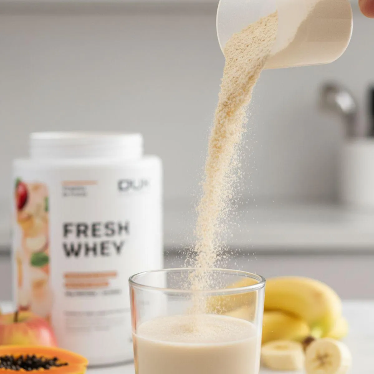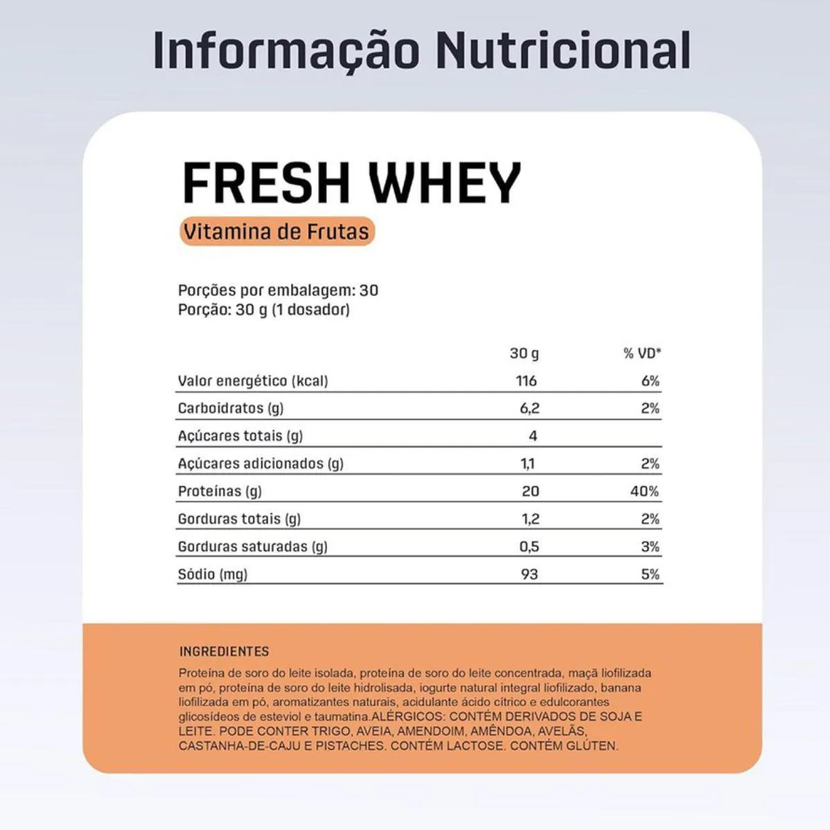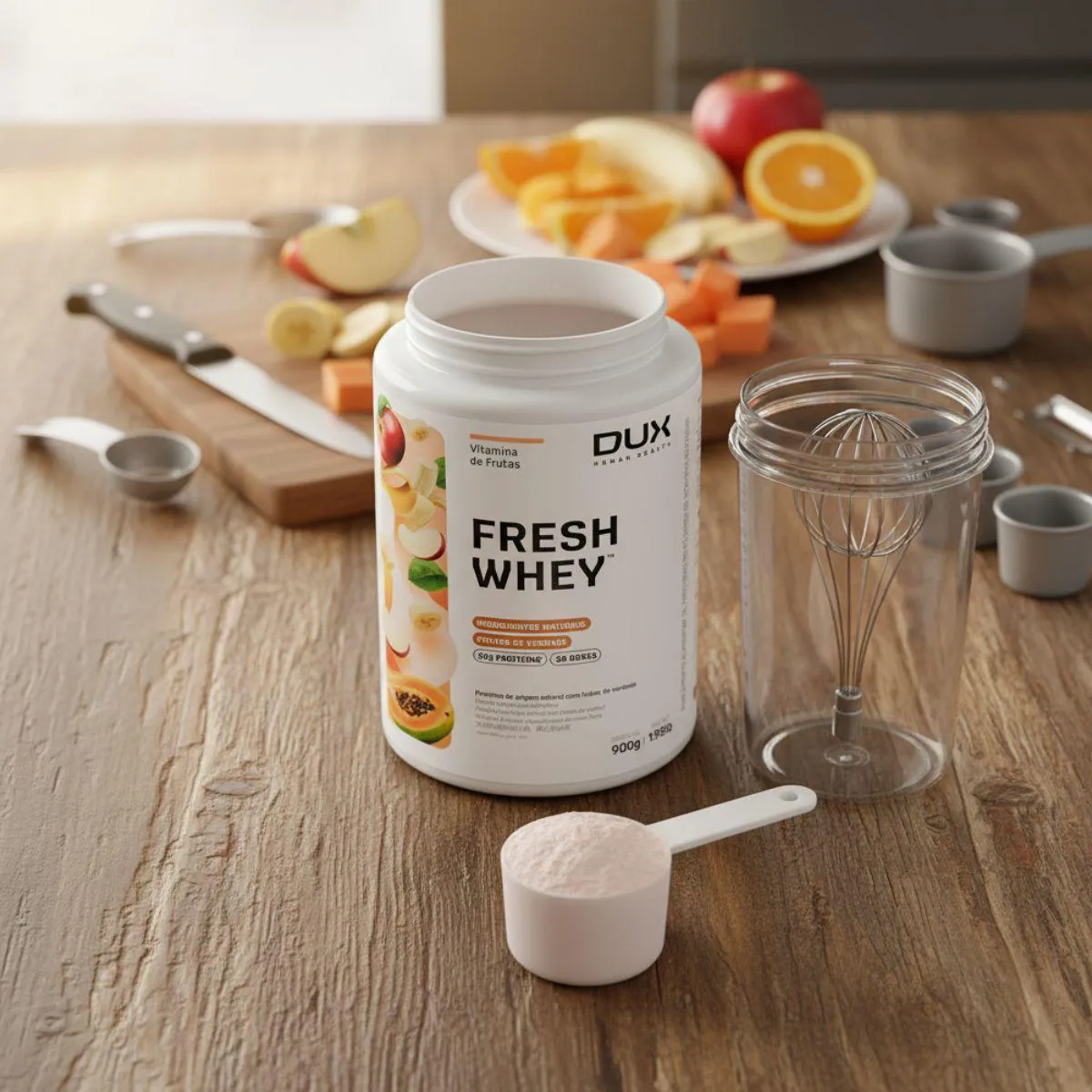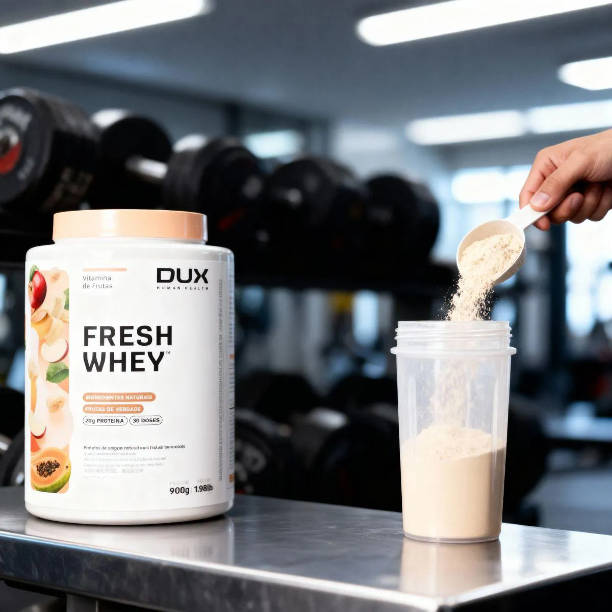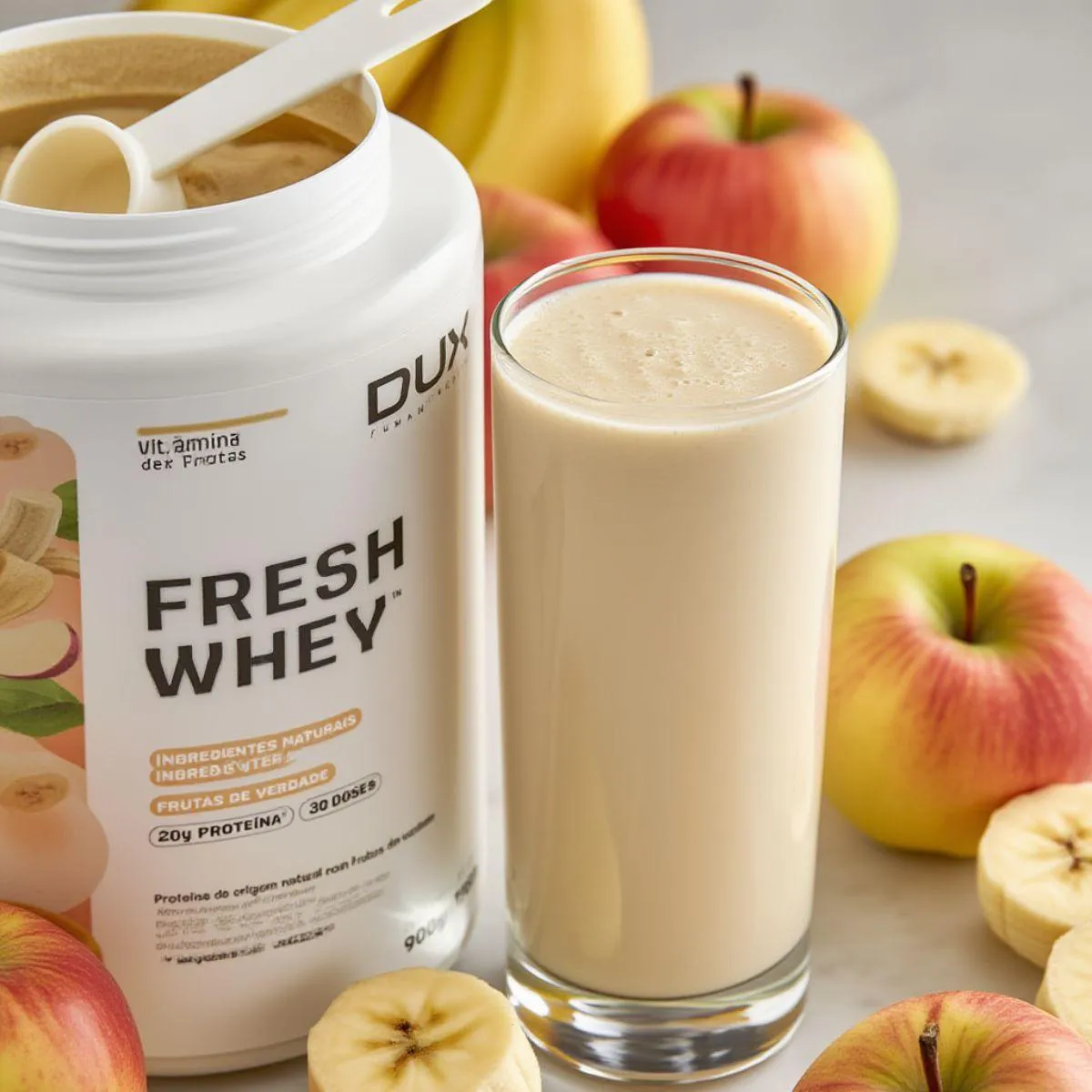 O Whey Protein Fresh 3W da Dux combina três fontes de proteína do soro do leite — concentrada, isolada e hidrolisada — para proporcionar um perfil completo de aminoácidos com digestão em diferentes velocidades. A linha Fresh utiliza ingredientes naturais, incluindo frutas e oleaginosas, e fornece cerca de 20 g de proteína por dose, com baixo teor de gordura e carboidratos.