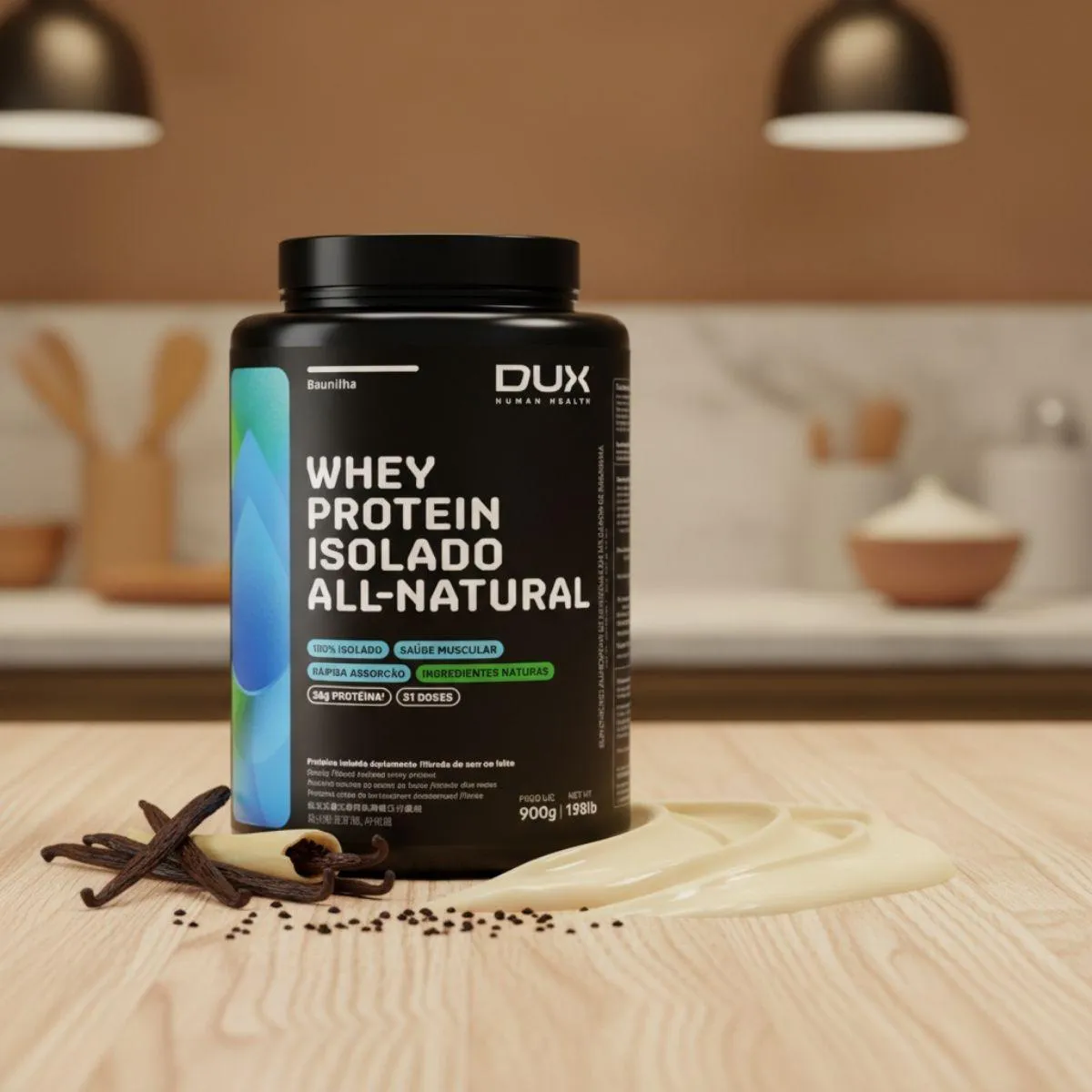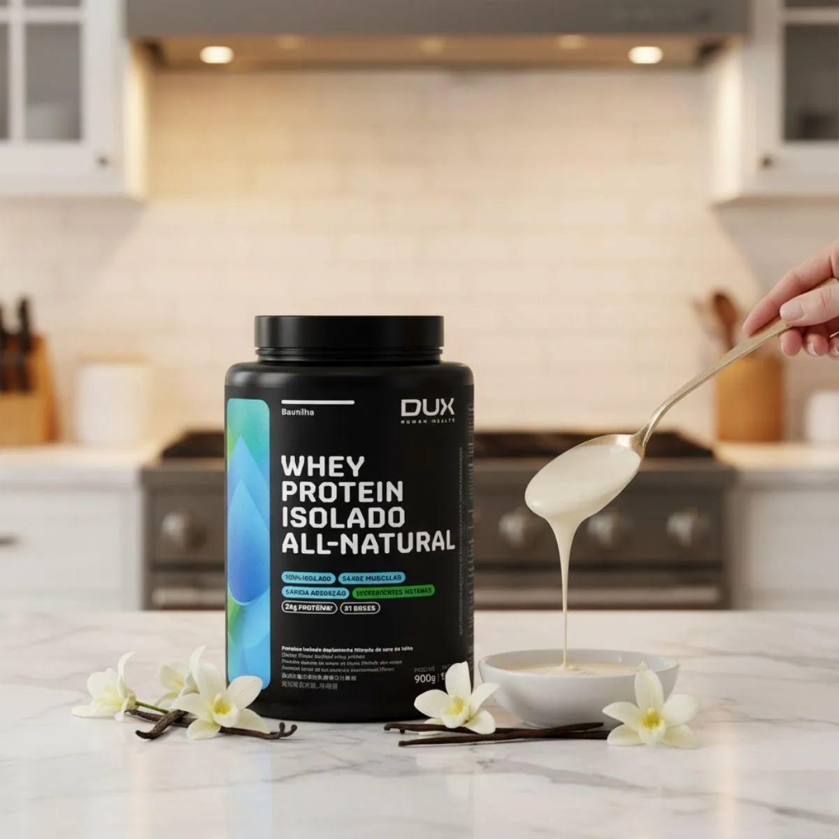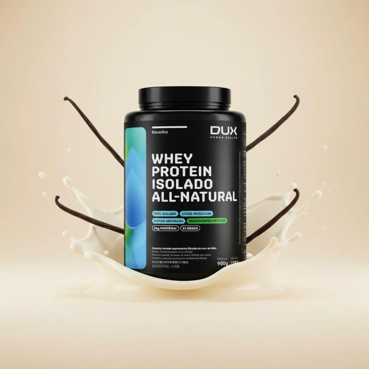 O Whey Protein Isolado All Natural da Dux foi desenvolvido para quem procura a pureza máxima das proteínas do soro do leite. A matéria‑prima passa por dupla filtração para remover gorduras e lactose, entregando cerca de 24 g de proteína por dose de 30 g com pouquíssimos carboidratos. A fórmula não utiliza aromas artificiais, adoçantes sintéticos nem açúcar, mantendo um perfil limpo e transparente.