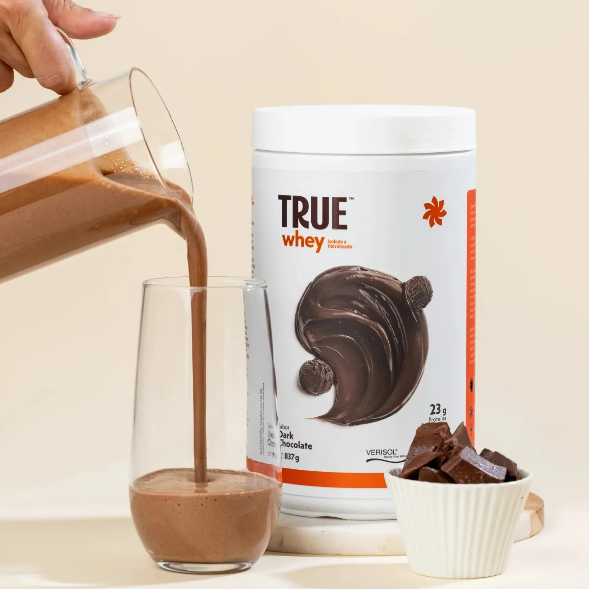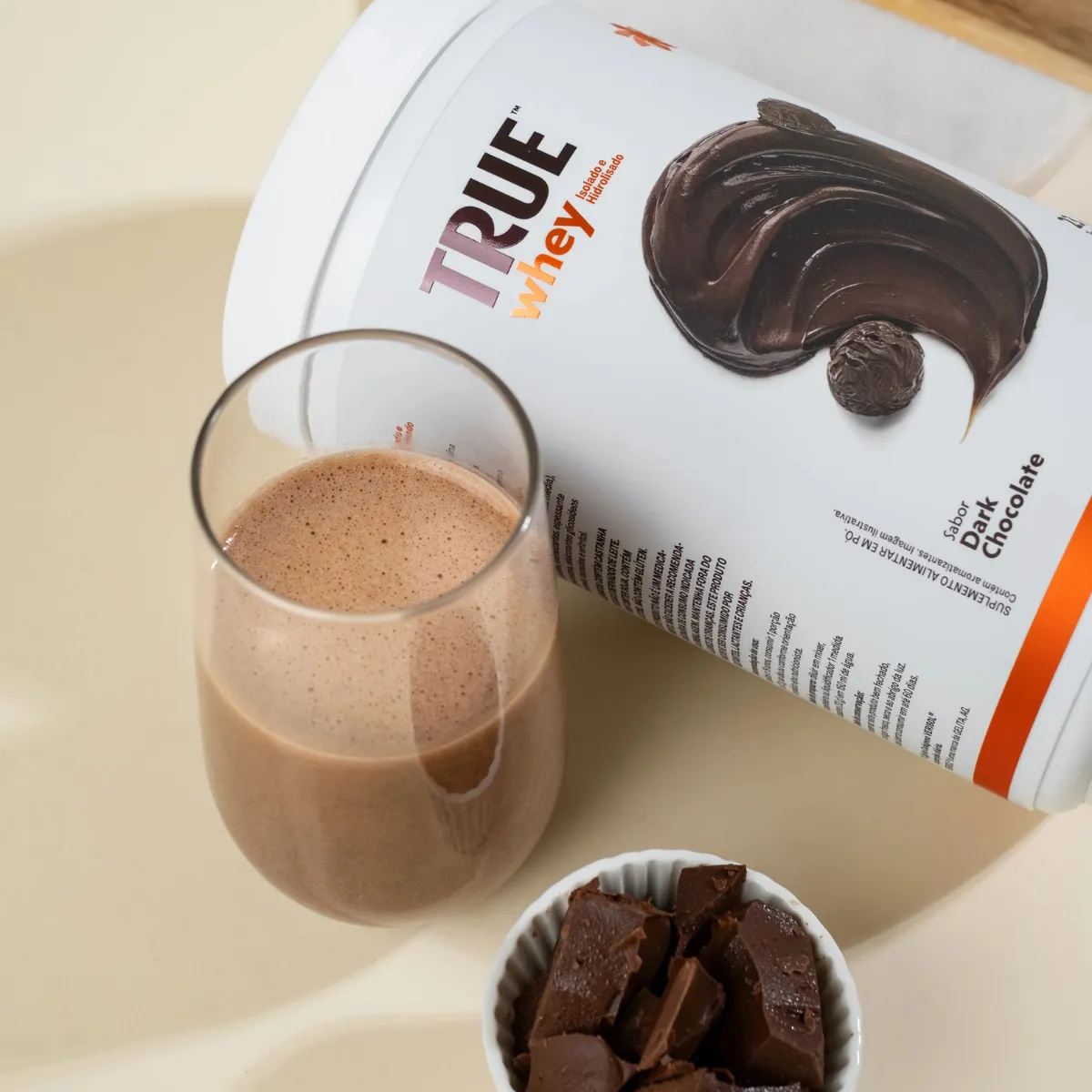 - Dilua uma porção do Whey Protein True Dark Chocolate em água ou bebida de sua preferência.