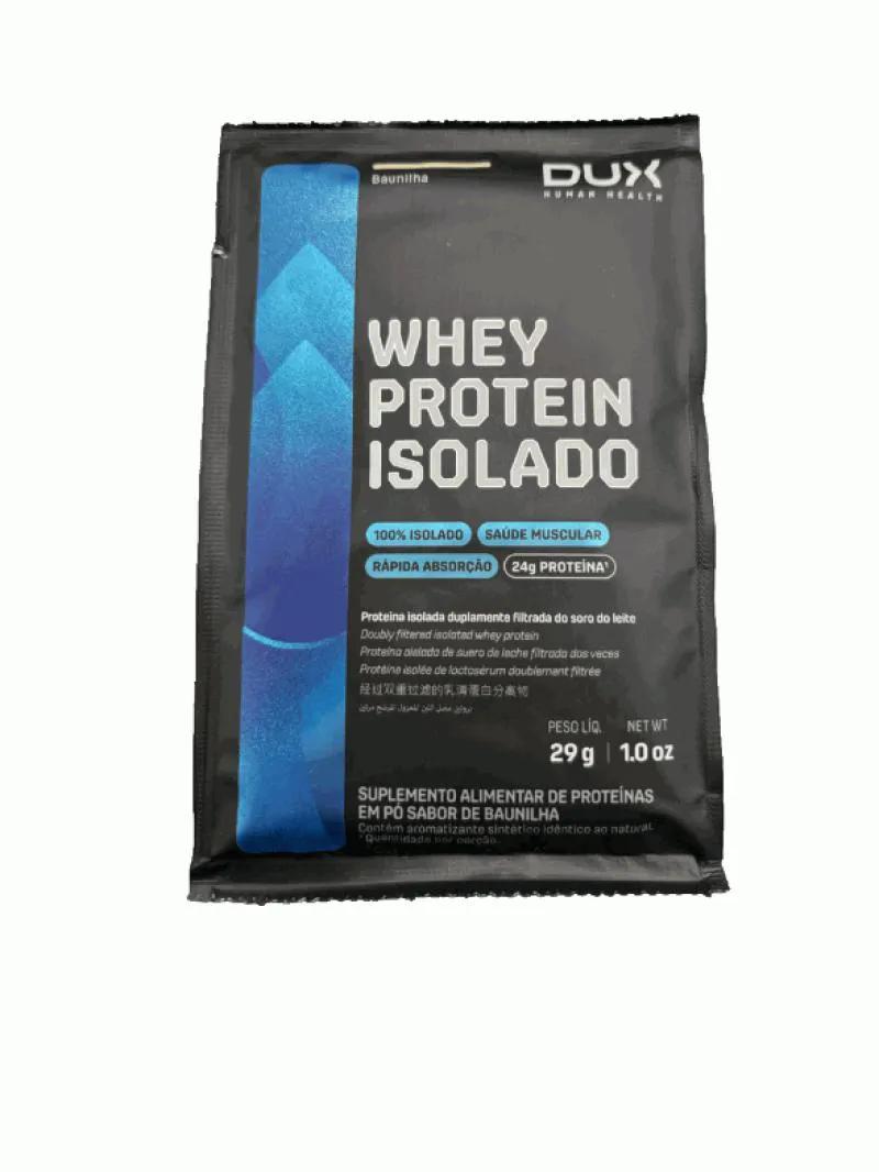 Whey Protein Isolado Sachê O Whey Protein Isolado Dux Nutrition possui baixo teor de gorduras e carboidratos, sendo ideal para construção e recuperação muscular sem perda de definição, como um snack fit prático ou sem culpa em suas receitas. Uma proteína 100% pura, duplamente filtrada, sem adição de outro tipo de Whey ou de proteínas inferiores. Se há um nutriente indispensável, é a proteína. Ela é feita de aminoácidos, que são os blocos de construção do nosso corpo. A proteína do soro do leite, em inglês “Whey Protein”, é uma das fontes de aminoácidos de melhor absorção, maior até que o frango ou peixe. Isso torna o Whey uma forma conveniente de ingerir proteína, melhorando a saúde, o bem-estar e os resultados dos treinos. BENEFÍCIOS: * Matéria-prima premium importada, obtida através do processo de extração de microfiltragem, sem renunciar do sabor real das nossas proteínas;* Aporte completo de aminoácidos: 6,2g de BCAAs; 4,7g de glutamina e 2,9g de leucina, por dose;* 24g de proteína;* Disponível em versões sem adoçantes artificiais, 100% naturais;* O nome diz tudo: Whey Protein Isolado 100% puro, com transparência total, do nome do produto à lista de ingredientes;* Não contém goma xantana, complexos vitamínicos à base de maltodextrina, espessantes, estabilizantes, conservantes ou qualquer outro ingrediente inferior;* Proteína moderna, desenvolvida por especialistas para atletas de esportes de performance (bodybuilding, crossfit e artes marciais), pessoas que buscam uma proteína com baixa caloria (para snacks fit e receitas sem culpa) e pessoas que buscam uma proteína ultrapura de altíssima qualidade;* Contém corantes 100% naturais, sem ingredientes artificiais.