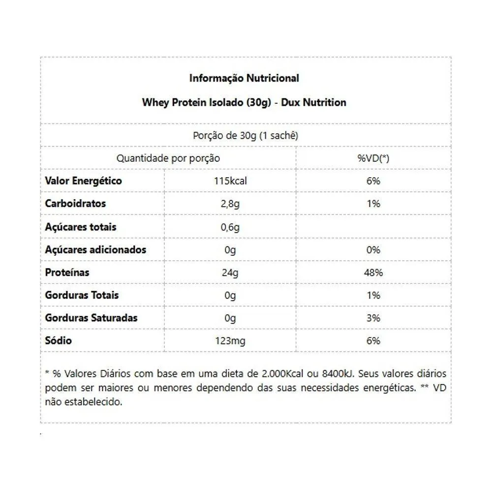 Whey Protein Isolado Sachê O Whey Protein Isolado Dux Nutrition possui baixo teor de gorduras e carboidratos, sendo ideal para construção e recuperação muscular sem perda de definição, como um snack fit prático ou sem culpa em suas receitas. Uma proteína 100% pura, duplamente filtrada, sem adição de outro tipo de Whey ou de proteínas inferiores. Se há um nutriente indispensável, é a proteína. Ela é feita de aminoácidos, que são os blocos de construção do nosso corpo. A proteína do soro do leite, em inglês “Whey Protein”, é uma das fontes de aminoácidos de melhor absorção, maior até que o frango ou peixe. Isso torna o Whey uma forma conveniente de ingerir proteína, melhorando a saúde, o bem-estar e os resultados dos treinos. BENEFÍCIOS: * Matéria-prima premium importada, obtida através do processo de extração de microfiltragem, sem renunciar do sabor real das nossas proteínas;* Aporte completo de aminoácidos: 6,2g de BCAAs; 4,7g de glutamina e 2,9g de leucina, por dose;* 24g de proteína;* Disponível em versões sem adoçantes artificiais, 100% naturais;* O nome diz tudo: Whey Protein Isolado 100% puro, com transparência total, do nome do produto à lista de ingredientes;* Não contém goma xantana, complexos vitamínicos à base de maltodextrina, espessantes, estabilizantes, conservantes ou qualquer outro ingrediente inferior;* Proteína moderna, desenvolvida por especialistas para atletas de esportes de performance (bodybuilding, crossfit e artes marciais), pessoas que buscam uma proteína com baixa caloria (para snacks fit e receitas sem culpa) e pessoas que buscam uma proteína ultrapura de altíssima qualidade;* Contém corantes 100% naturais, sem ingredientes artificiais.