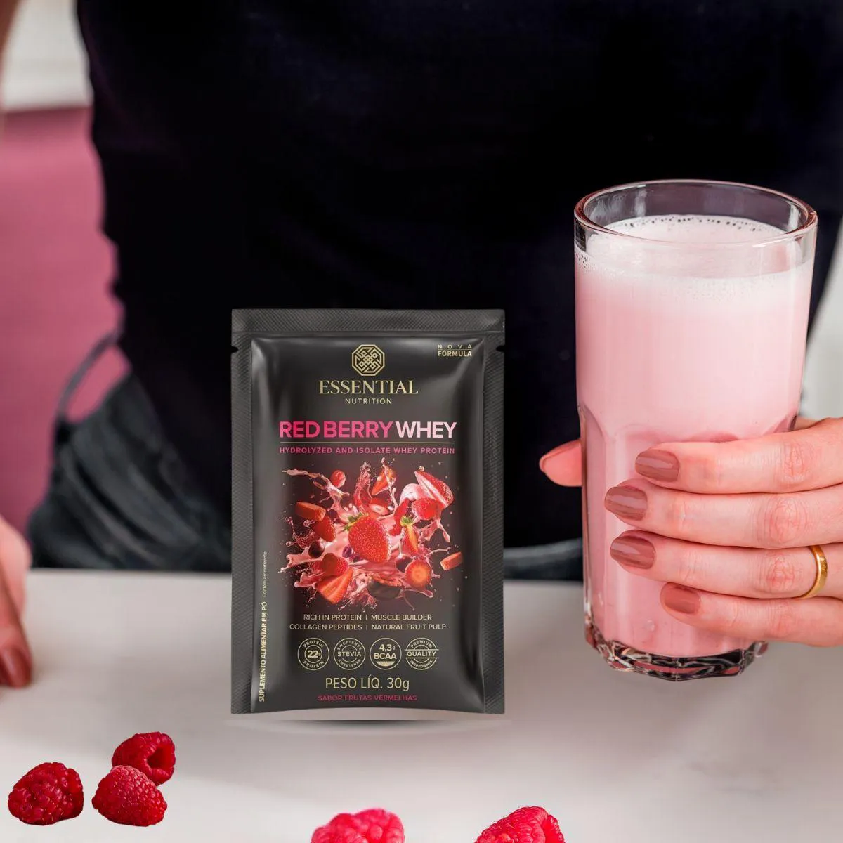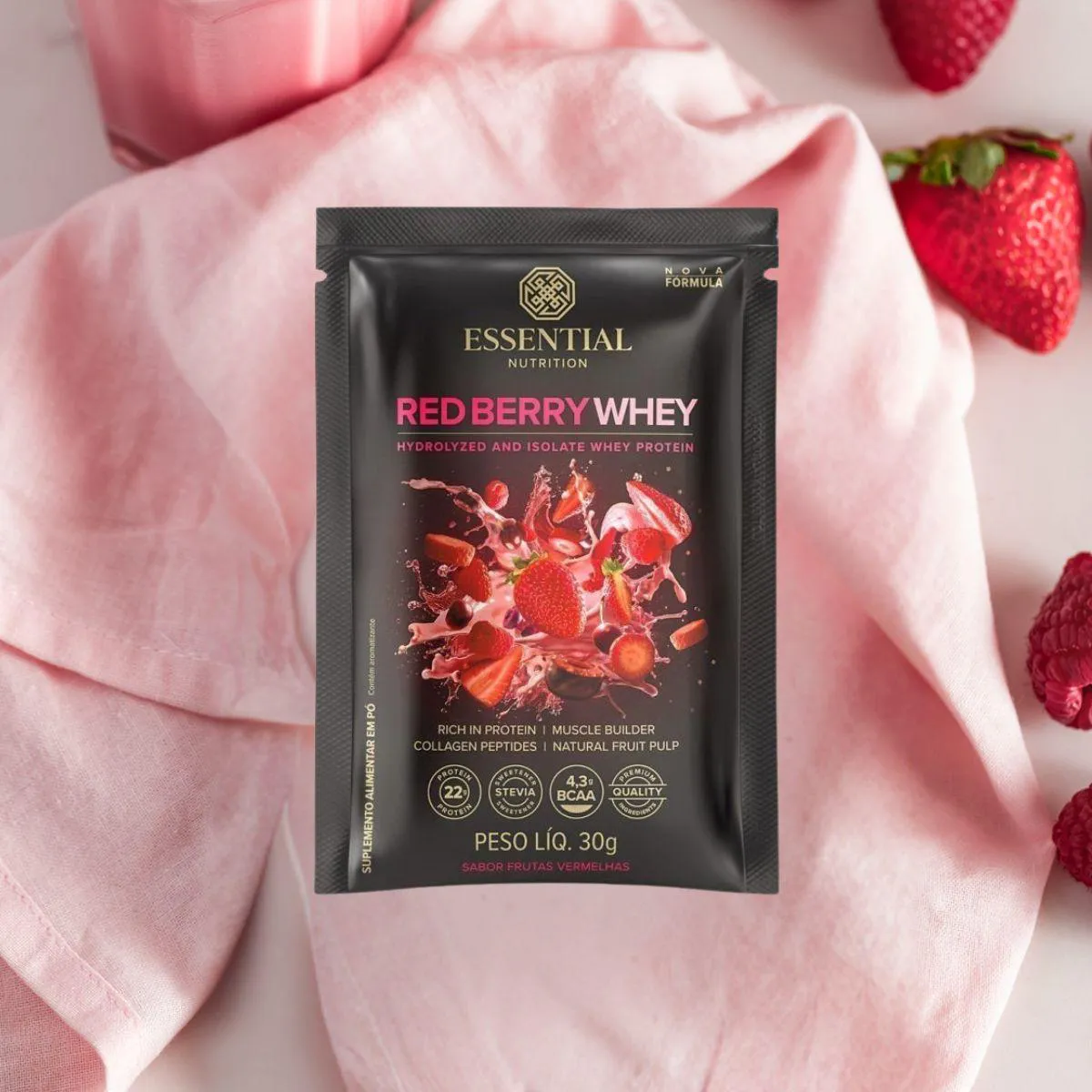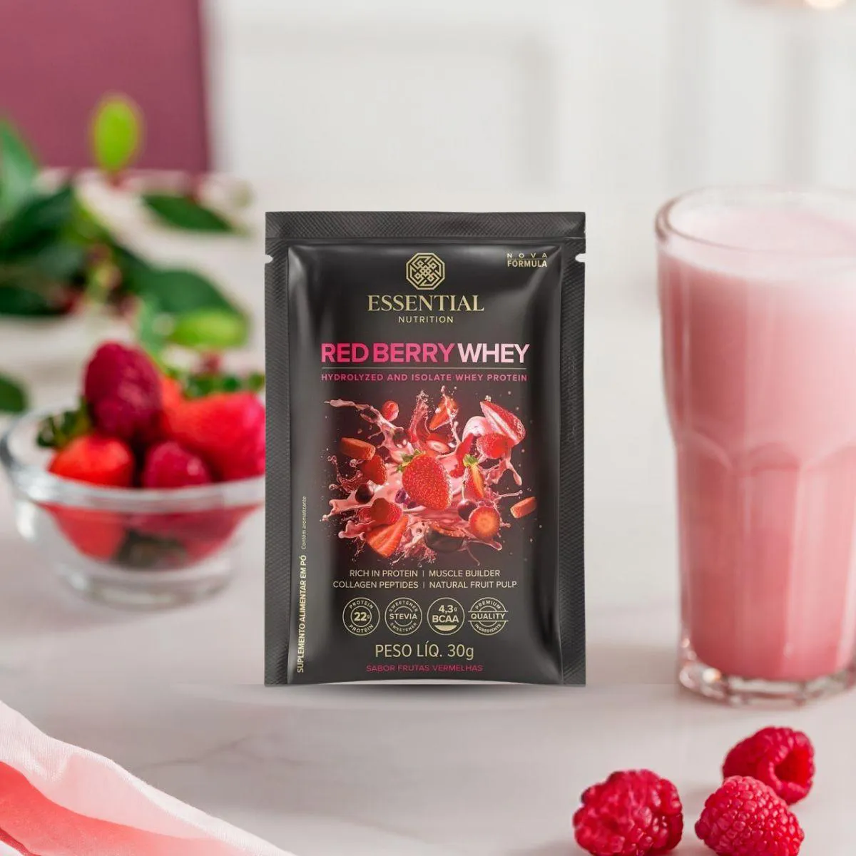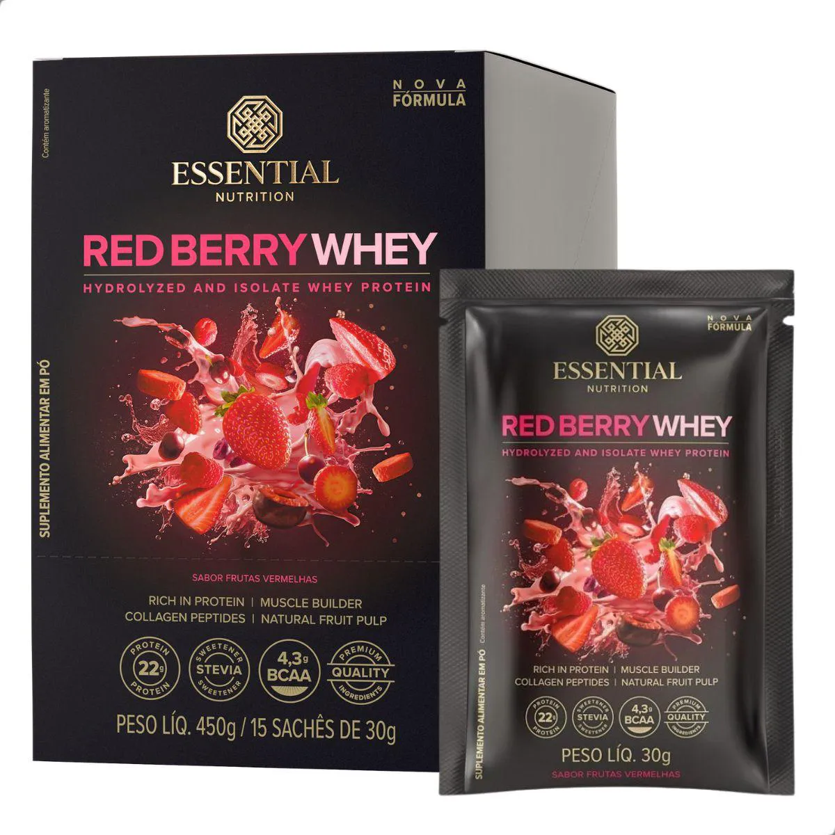 Whey Protein Red Berry 34 g da Essential Nutrition vem em 15 sachês totalizando 510 g, combinando whey protein isolado e hidrolisado com frutas vermelhas liofilizadas e peptídeos de colágeno.