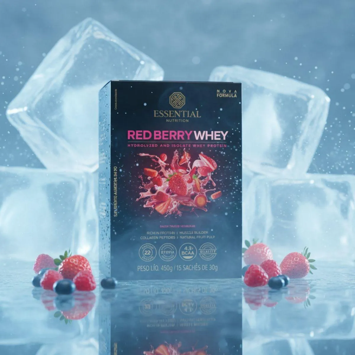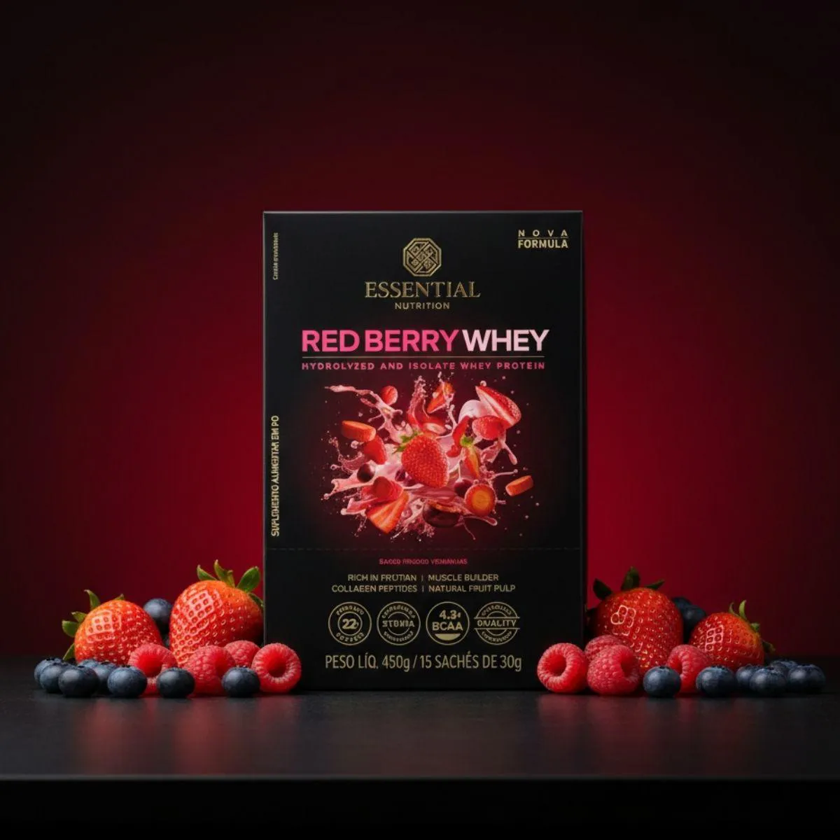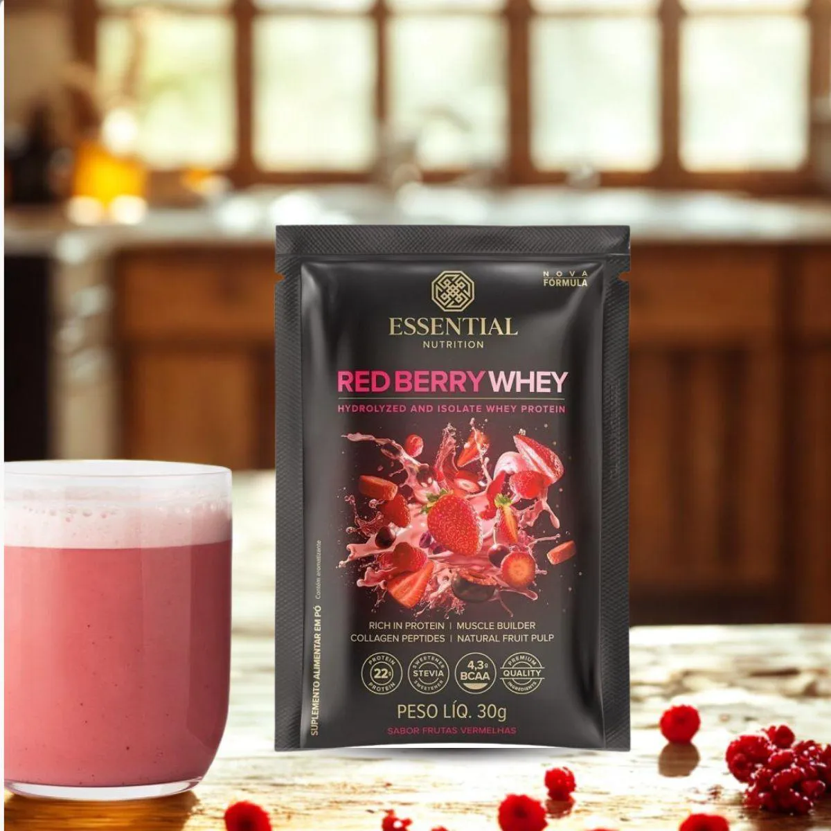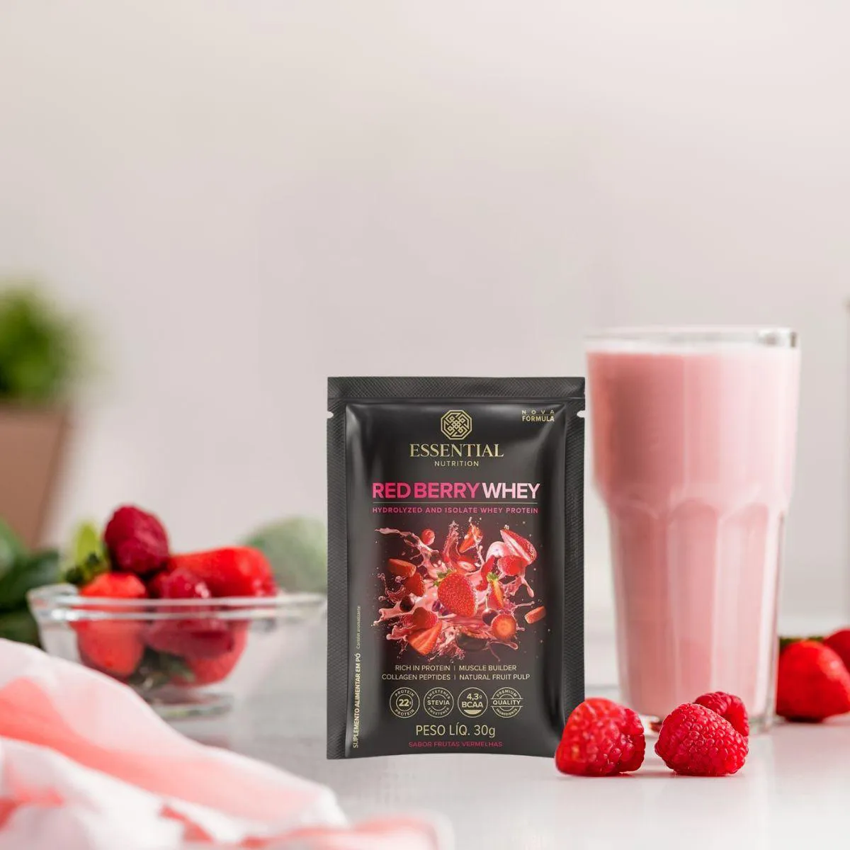 Whey Protein Red Berry 34 g da Essential Nutrition vem em 15 sachês totalizando 510 g, combinando whey protein isolado e hidrolisado com frutas vermelhas liofilizadas e peptídeos de colágeno.
