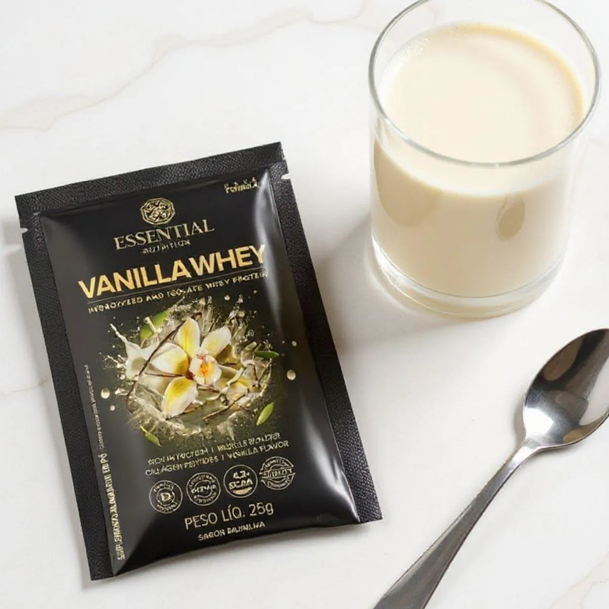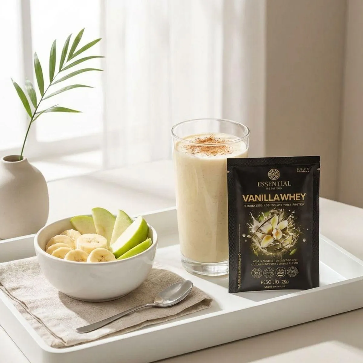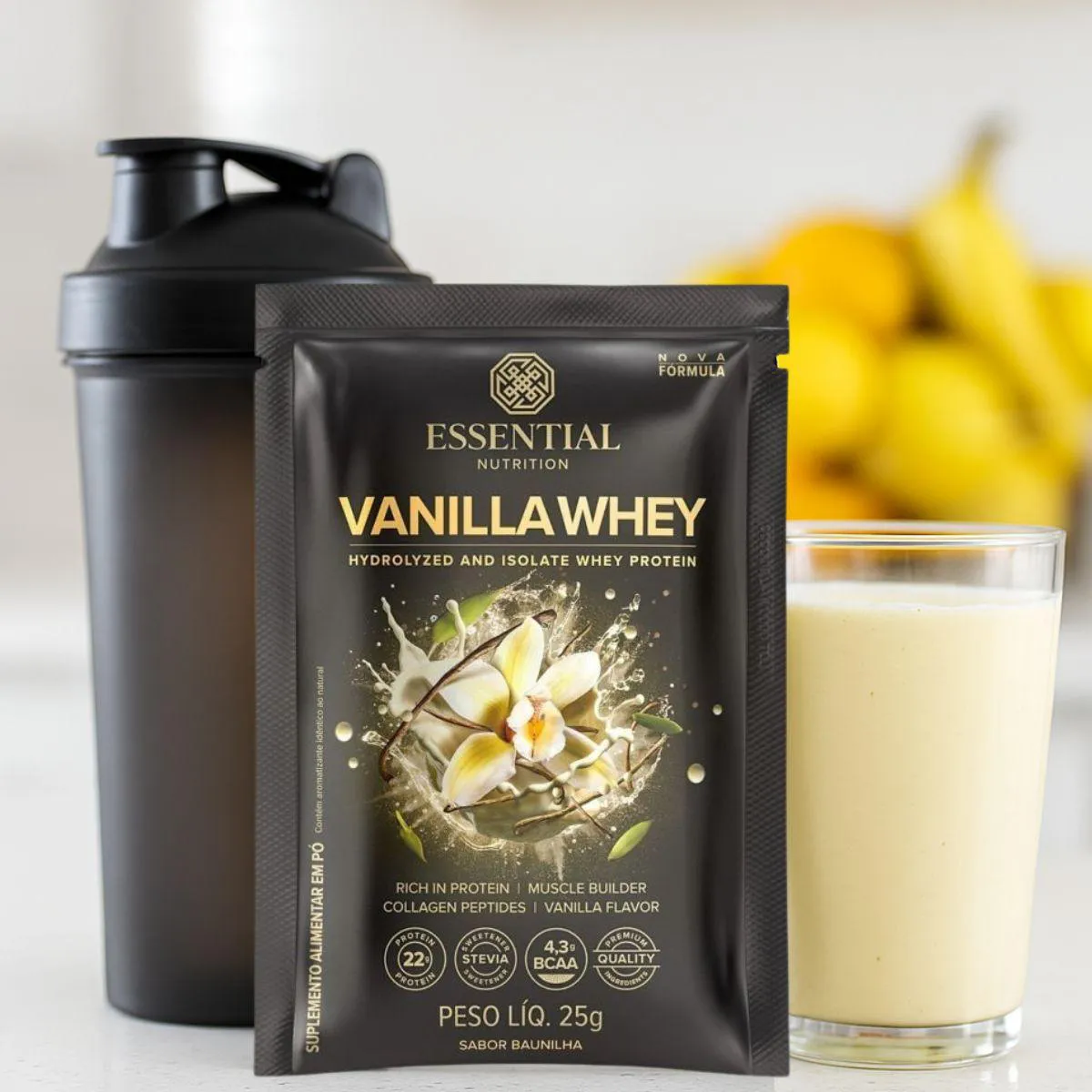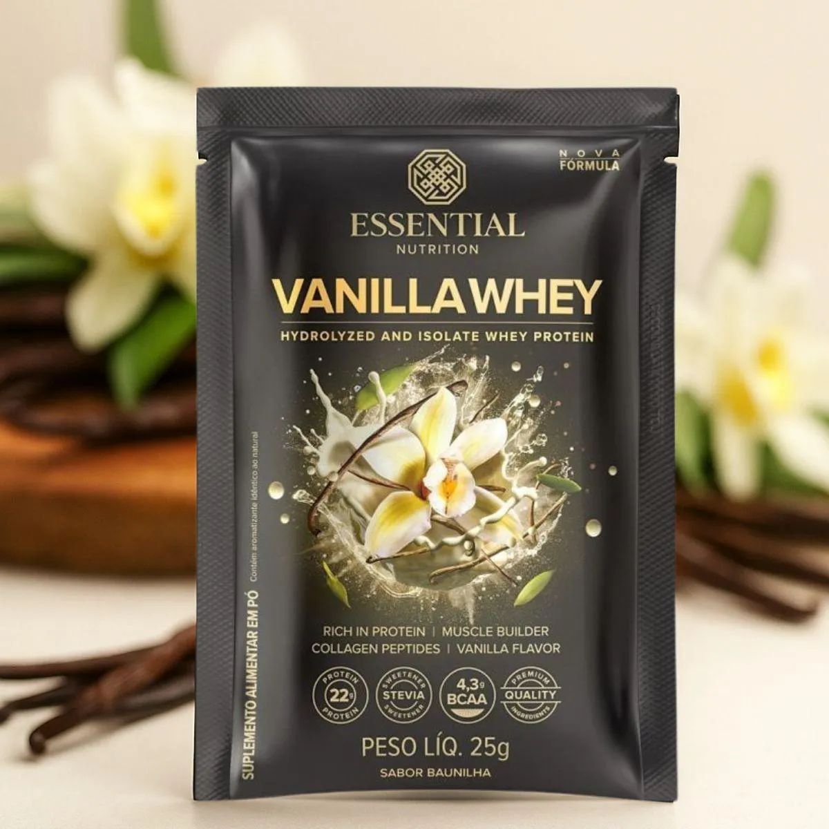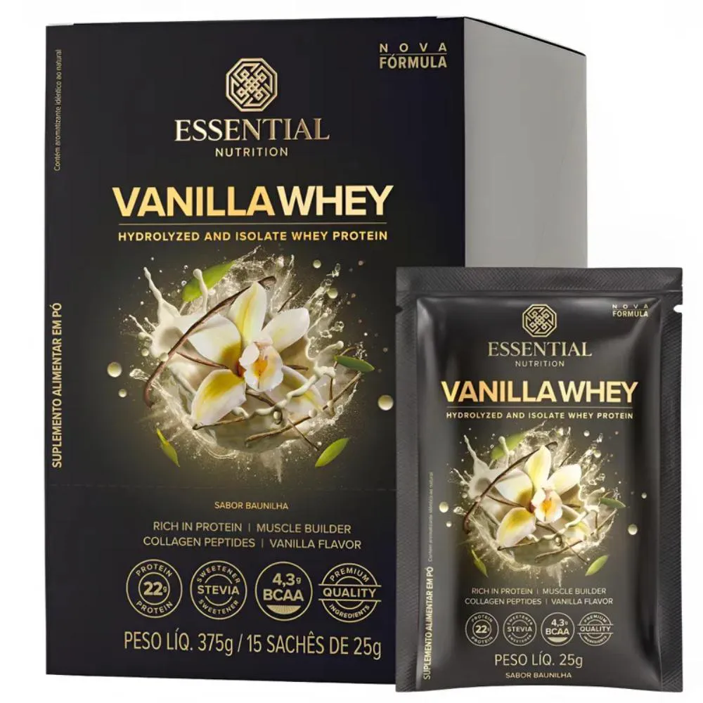 Whey Protein Vanilla 30 g da Essential Nutrition apresenta 15 sachês individuais totalizando 450 g, combinando whey isolado e hidrolisado com aroma natural de baunilha. Cada porção oferece 22 g de proteína de alto valor biológico.