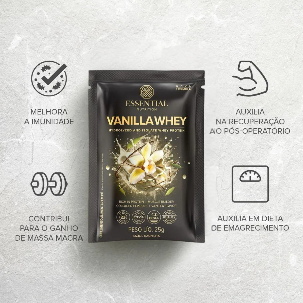 O diferencial está no sabor suave de baunilha obtido por aroma natural e na pureza das proteínas utilizadas, sem prometer resultados rápidos.