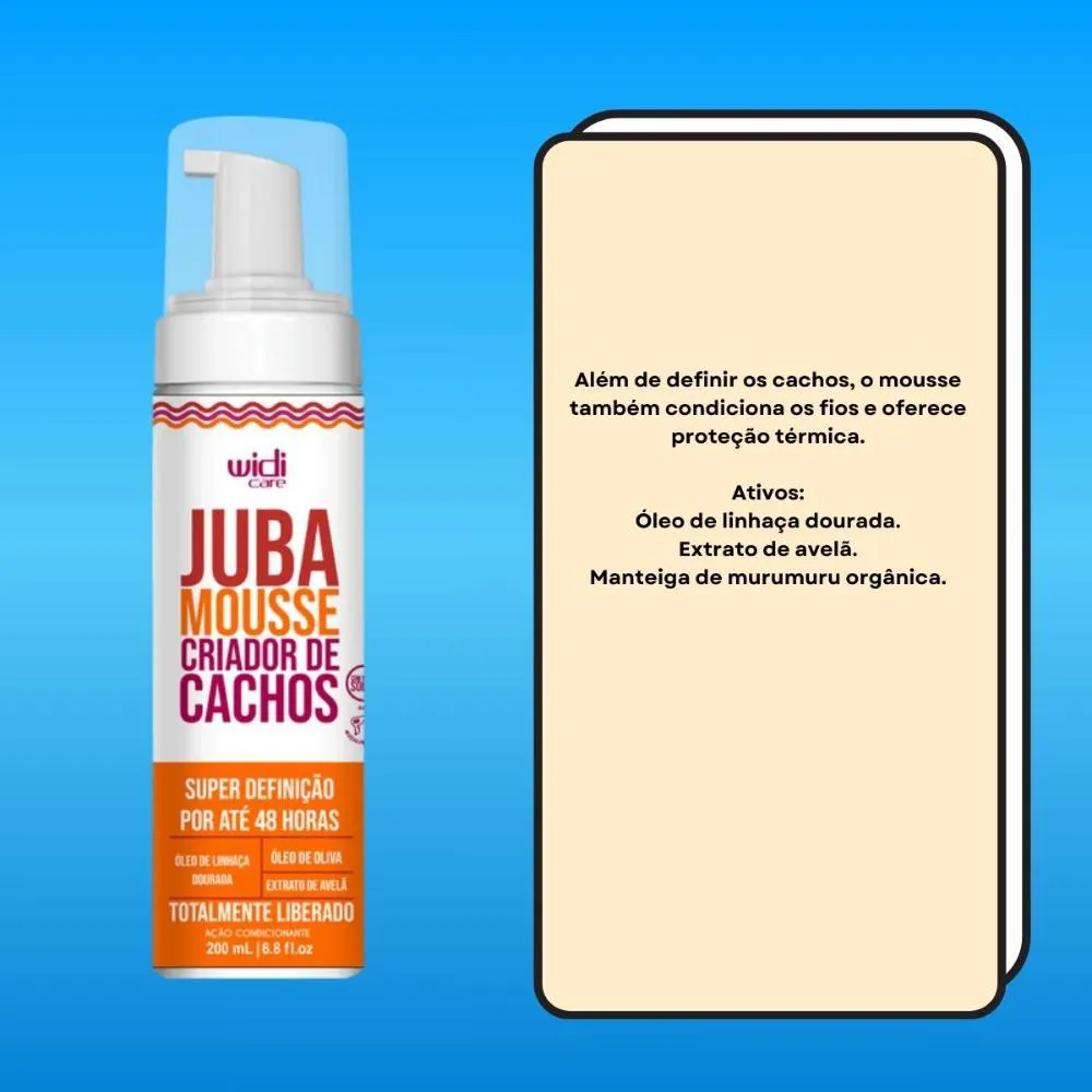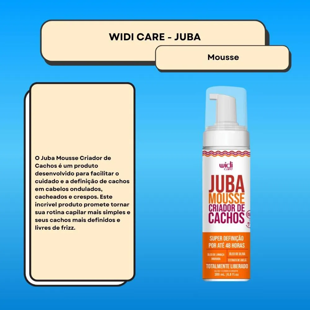 O Widi Care Juba Mousse Criador de Cachos 200ml é um produto para Cabelos da Widi Care, desenvolvido para tratamento e performance no dia a dia, alinhado à proposta da linha Juba.Para Qual Tipo de cabelo é Indicado?