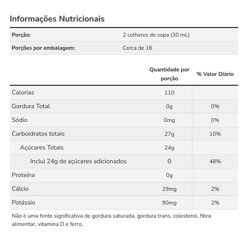 Cada frasco contém 473ml de Xarope de Bordo Orgânico Grau A, proporcionando uma quantidade ideal para o uso prolongado. A embalagem facilita o manuseio e o armazenamento do xarope, sendo prática para o uso diário em diversas receitas ou como adoçante para bebidas. Validade longa