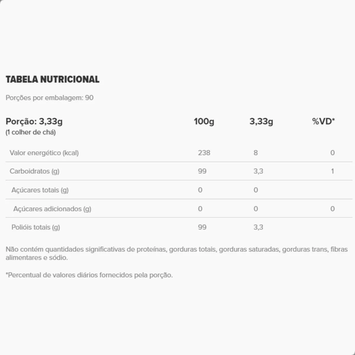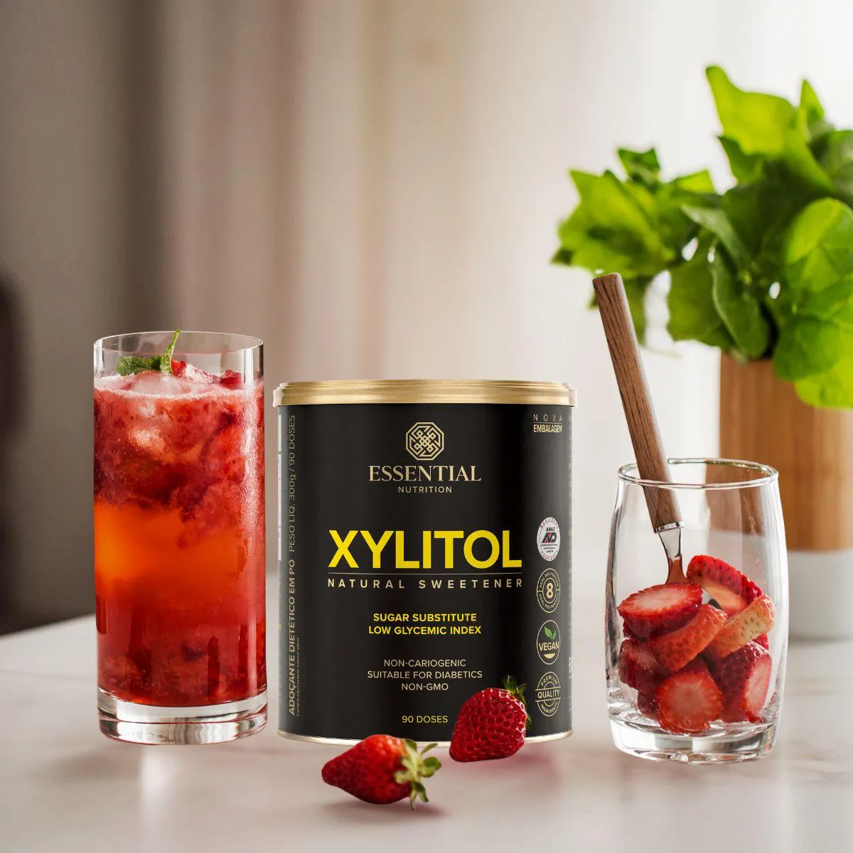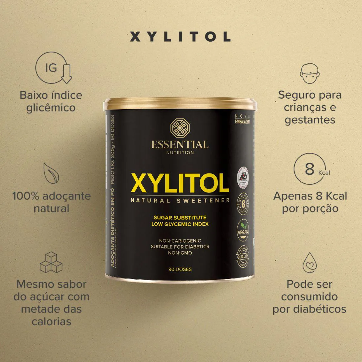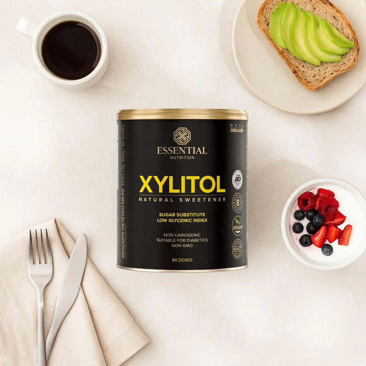 A fórmula contém 100% xilitol de fontes vegetais, sem glúten, lactose, corantes ou conservantes. Sua estabilidade térmica permite utilizar em receitas de forno e fogão sem perda de doçura.
