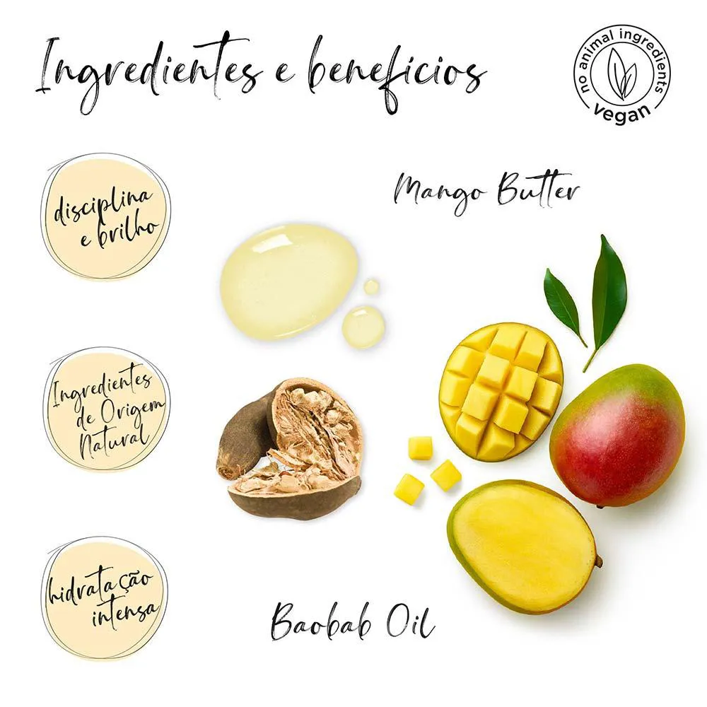 Sua fórmula é 100% natural e rica em princípios ativos que oferecem leveza e brilho. A manteiga de manga e o óleo de baobá se unem numa mistura precisa que é indicada exatamente para os cabelos cacheados, onde muitas vezes são secos e frisados, proporcionando uma hidratação perfeita.