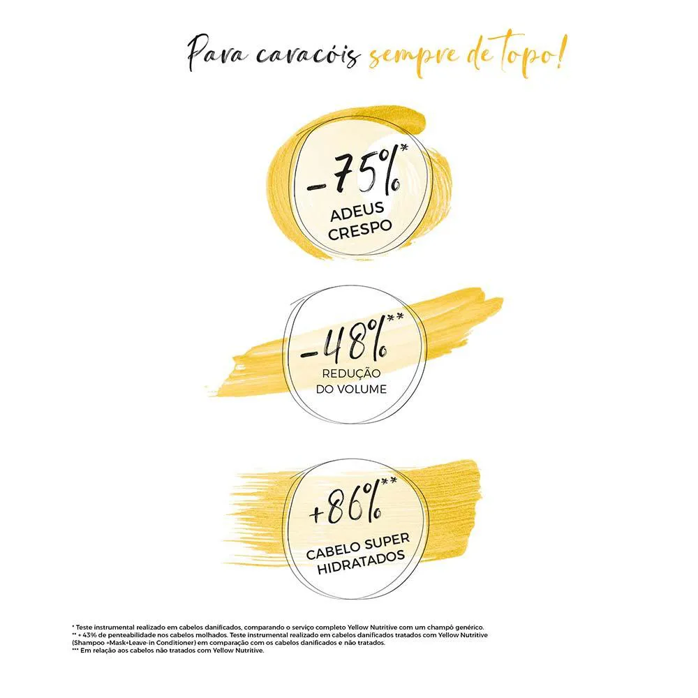 A linha yellow curls foi desenvolvida para tratar especialmente das mulheres que assumem e tem orgulho de seus cachos. Curls garante 86% a mais de hidratação, mais 52% de disciplina e menos 75% de frizz em até quatro dias, mesmo em condições extremamente úmidas.