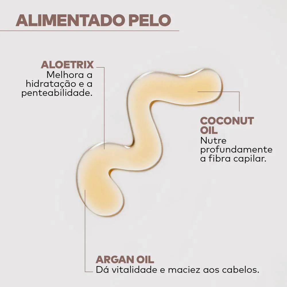- Óleo de Coco – Altamente nutritivo e emoliente, repõe os nutrientes essenciais para um cabelo saudável e hidratado.