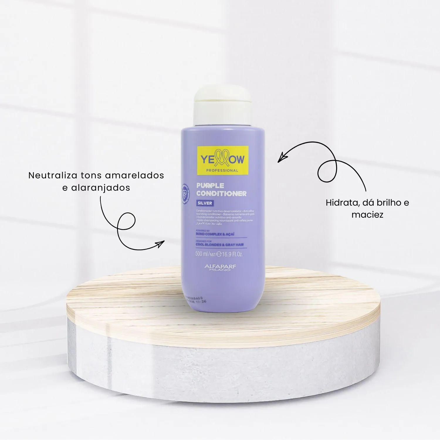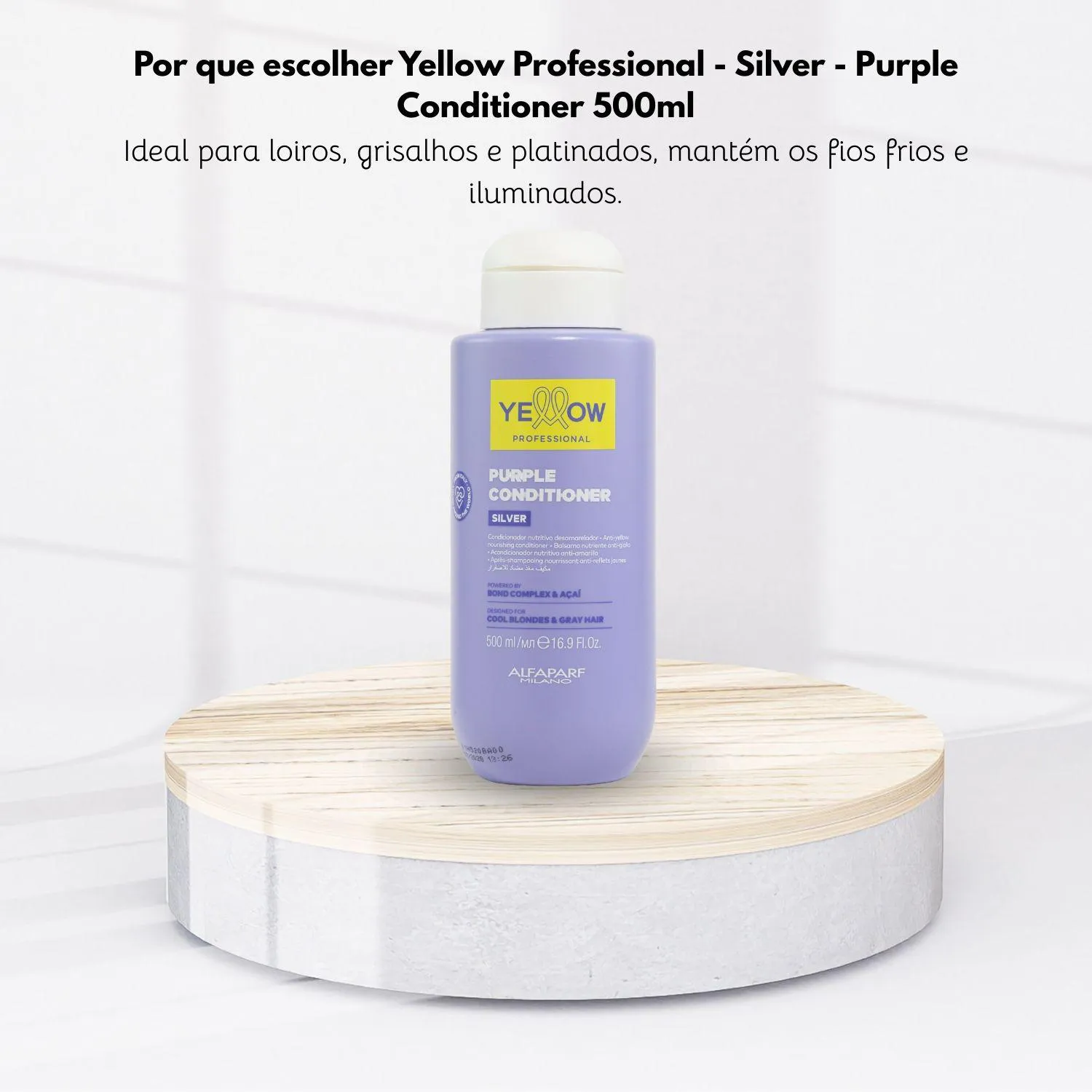 Yellow Silver condicionador 500ml Condicionador para cabelos loiros platinados e grisalhos. Yellow Silver devolve a cor desejada enquanto promove maciez. Condicionador Yellow Silver suaviza completamente os fios e elimina os tons amarelados ou alaranjados que surgem com o tempo. Além disso, proporciona brilho, maleabilidade e cria um escudo protetor capaz de prevenir os efeitos da poluição nos fios. Conselho de Aplicação: Após lavar os fios com o shampoo, aplique no comprimento e pontas. Deixe agir de 3 a 5 minutos. Em seguida, enxágue bem. Ação: Bagas de Açaí: atua internamente nas causas que levam ao amarelamento dos fios. Rosa de Jericó: neutraliza odores e cria um filme protetor no cabelo para proteger contra as ações dos agentes externos. Resultado: Seu cabelo com cor preservada e brilho intenso.