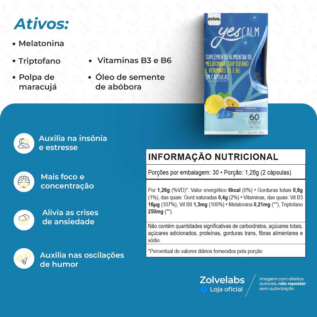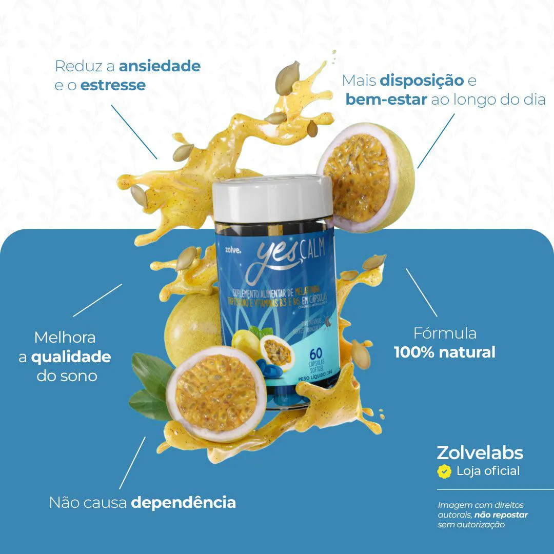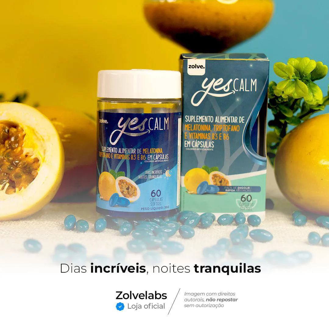 Yes Calm é um suplemento em cápsulas, formulado para quem busca serenidade mental e melhora na qualidade do sono, sem recorrer a tranquilizantes farmacêuticos. Sua composição alia melatonina, L-triptofano, vitaminas B3 e B6, extrato de maracujá e óleo de semente de abóbora.