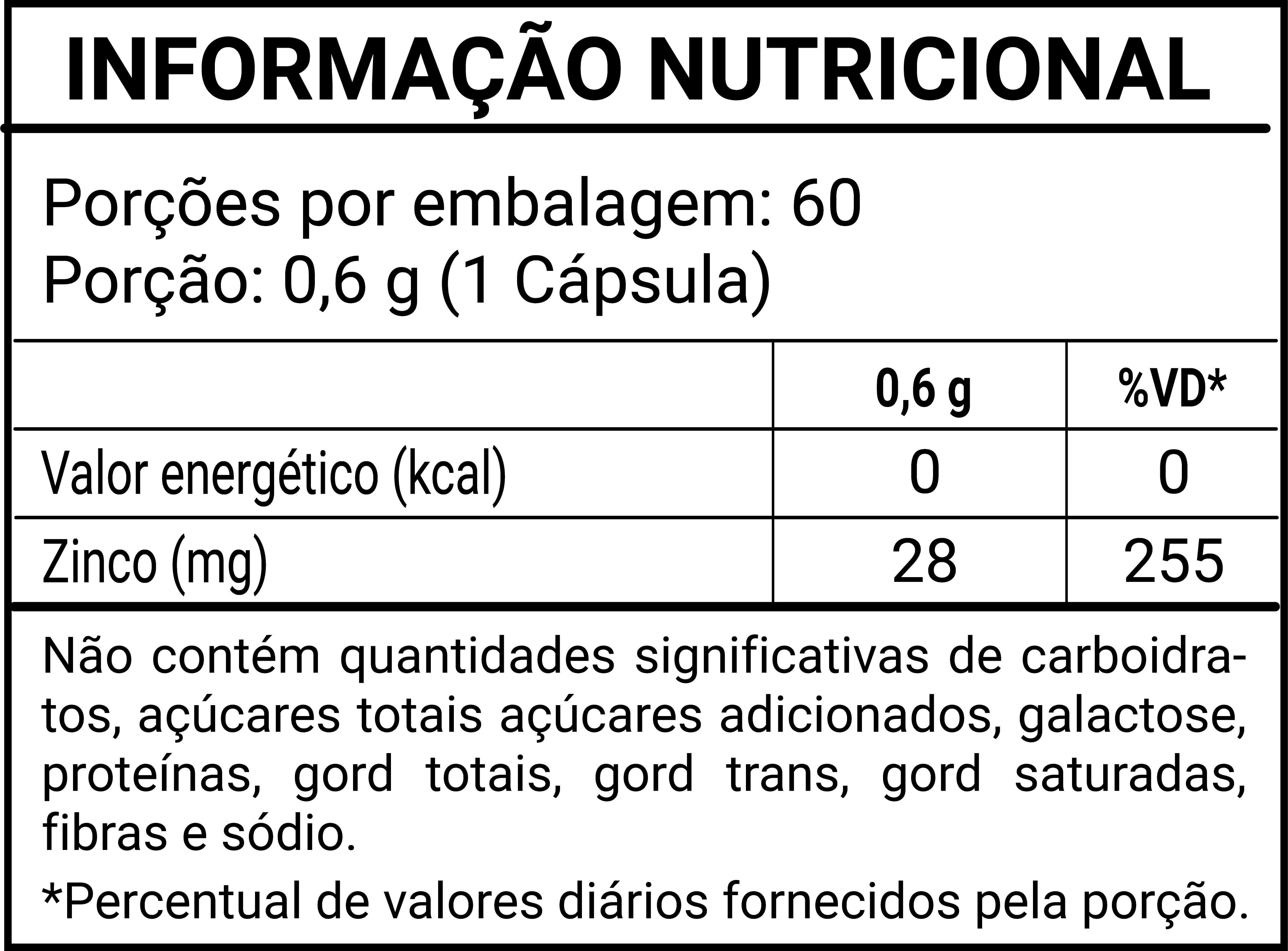 Ingredientes: Bisglicinato de zinco e excipiente q.s.p. 500 mg; Composição da Cápsula: Gelatina vegetal e água.