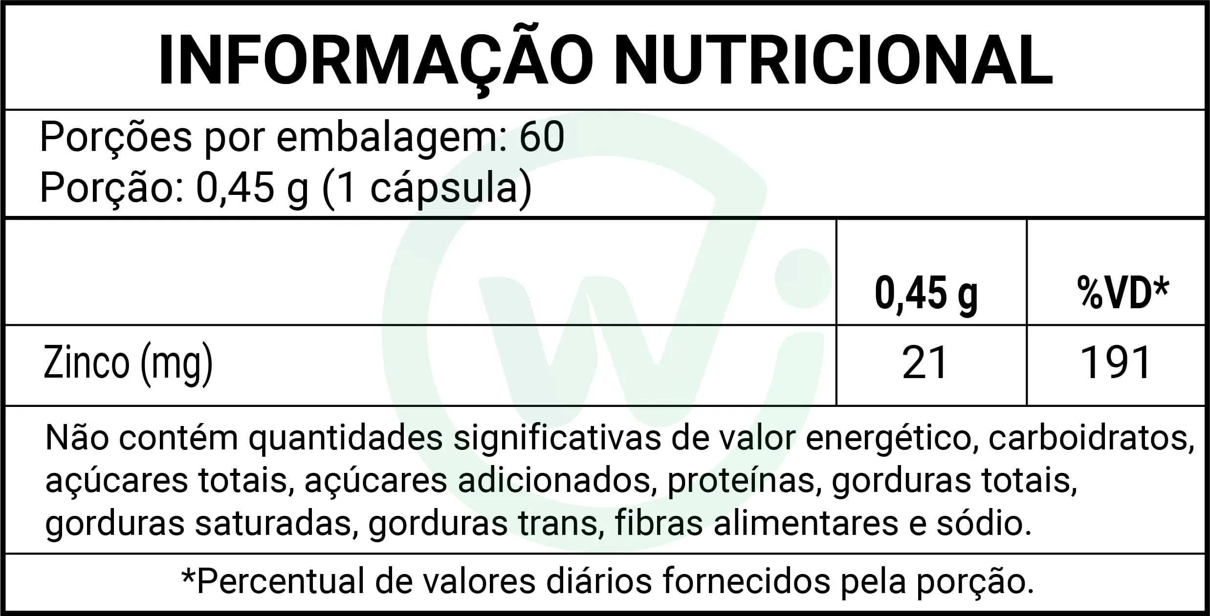 Zinco quelato e Antiumectante Silicato de Magnésio; Composição da cápsula: Gelatina e água.
