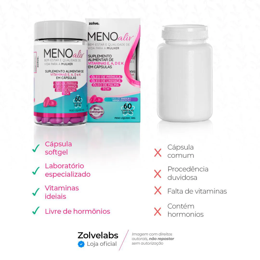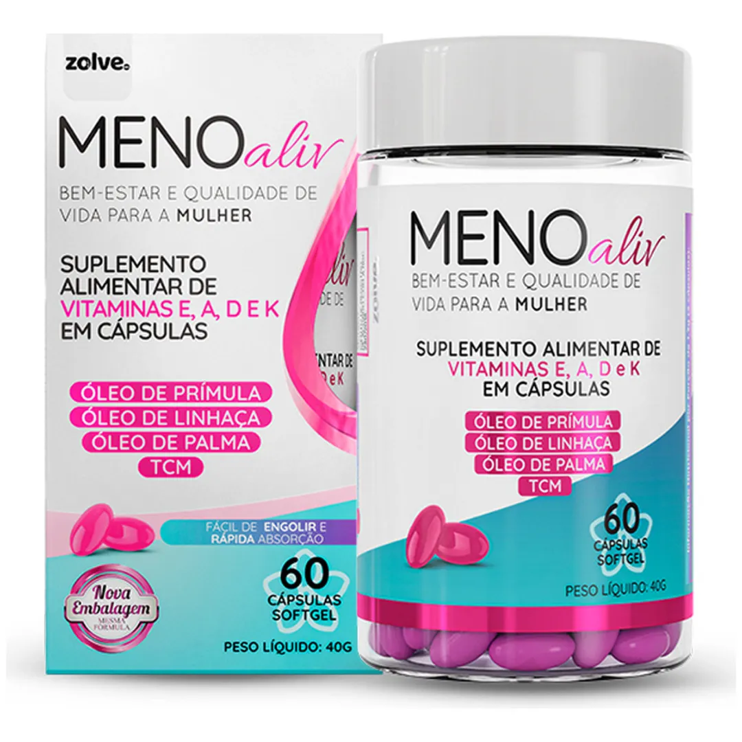 Meno Aliv é um suplemento em cápsulas softgel desenvolvido para mulheres que desejam atravessar o período de menopausa com mais conforto e harmonia. Com binômio de lipídios ─ óleo de prímula e óleo de linhaça ─ e vitaminas A, D, E e K, oferece suporte natural ao organismo feminino sem caracterizar-se como medicamento.