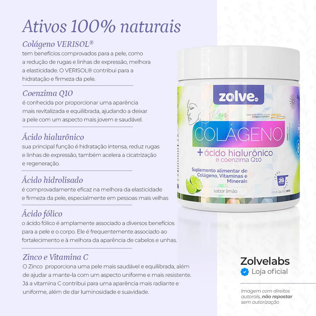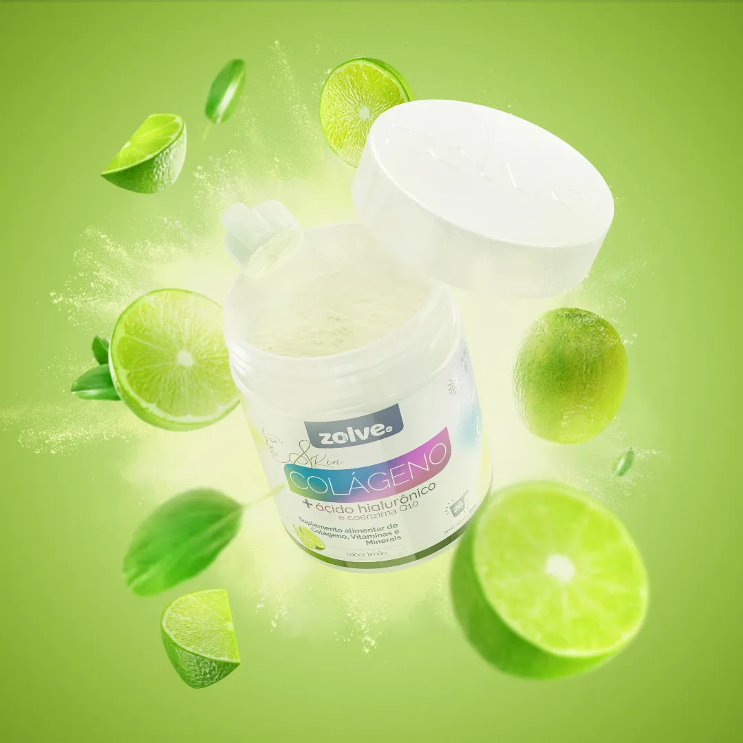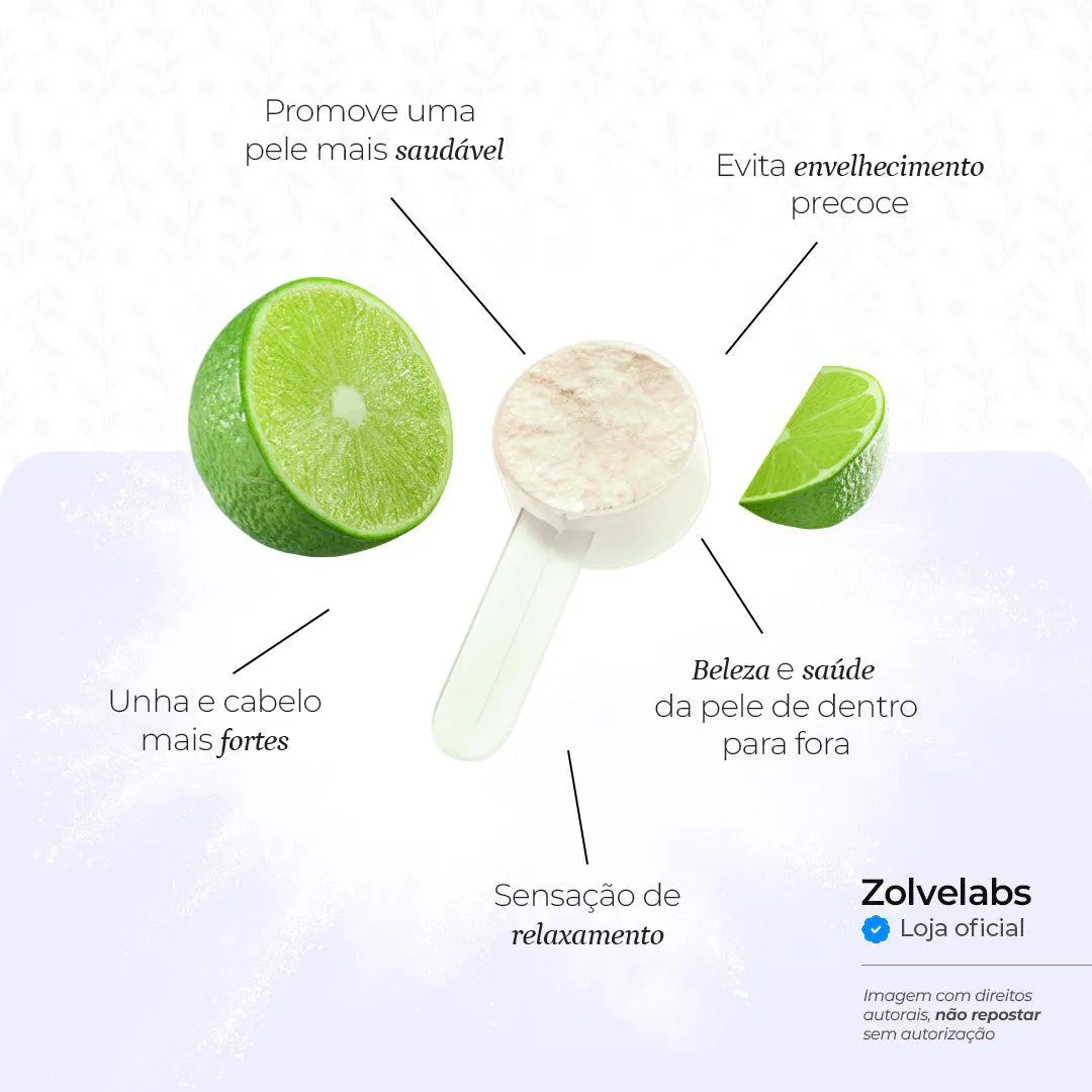 Colágeno Tipo I – Limão é um suplemento em pó com formulação completa, que combina colágeno Verisol®, ácido hialurônico, Coenzima Q10, ácido fólico, vitamina c e zinco. Sabor refrescante que facilita o consumo diário.
